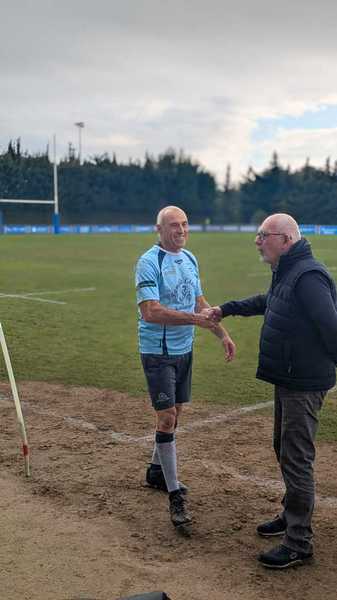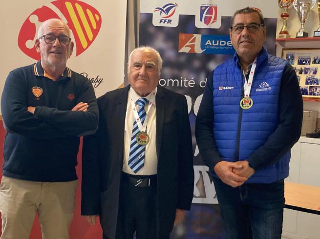 Remi Baron et Eric Bano honorés de la médaille du bénévolat FFR remise par Joel Castany président de la Ligue Occitanie.